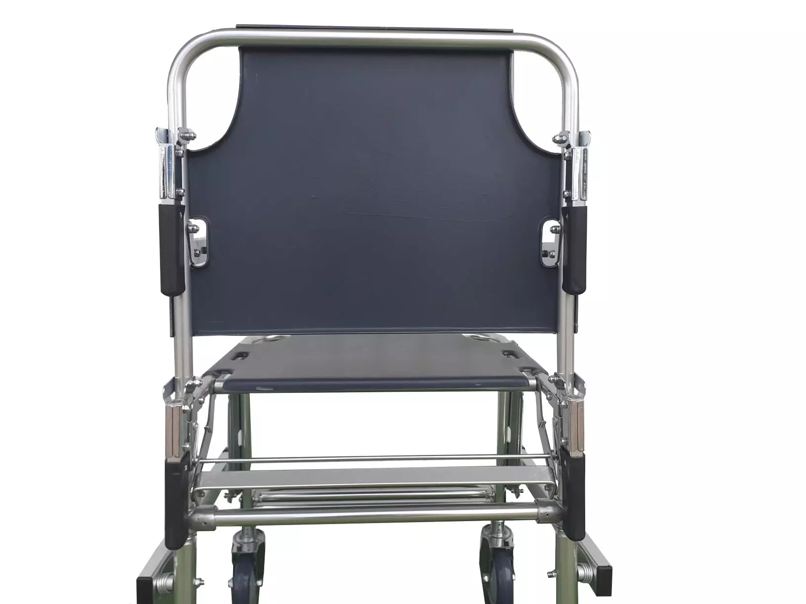 Z przodu krzesła znajdują się dwie dźwignie wysuwane teleskopowo z gumowymi, profilowanymi rączkami, które umożliwiają komfortowy transport pacjentów.