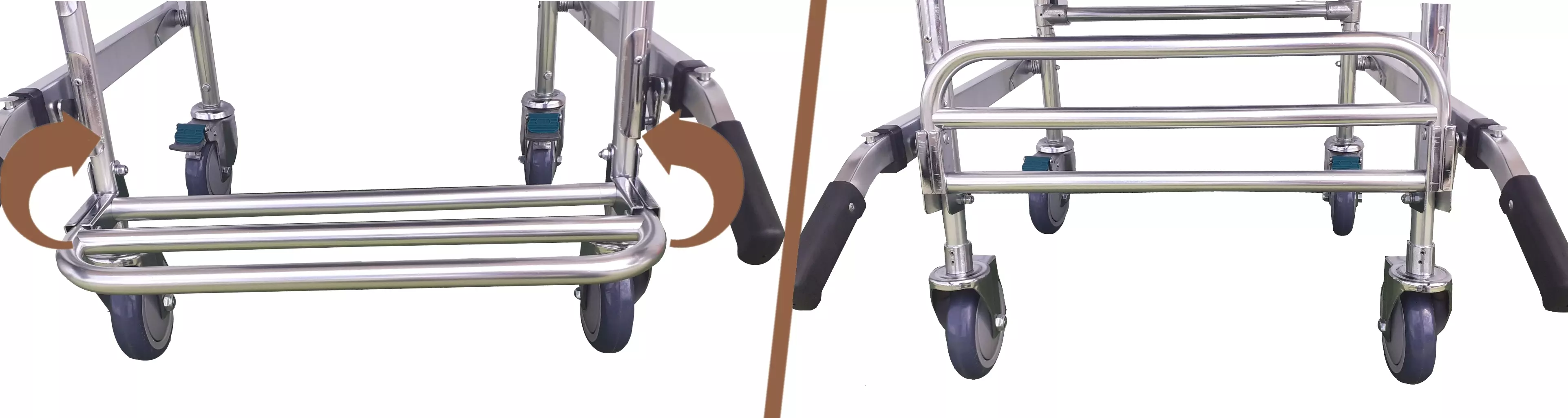 Komfort pacjenta podczas transportu jest bardzo ważny. Dlatego w naszym krześle znajdują się uchwyty pod ręce oraz podnóżek. Elementy te można złożyć w mgnieniu oka, tak jak na zdjęciach poniżej.