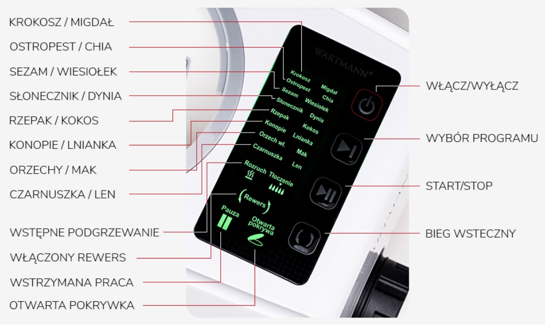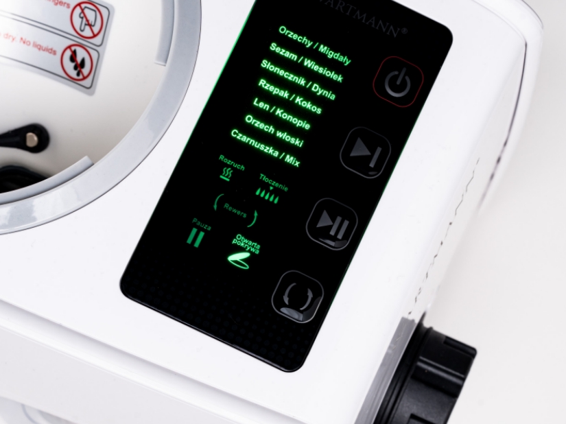 Model EVO został wyposażony w 16 automatycznych programów, dopasowanych do najpopularniejszych surowców. Urządzenie obsługuje ponad 60 rodzajów nasion, pestek i orzechów, m.in.: